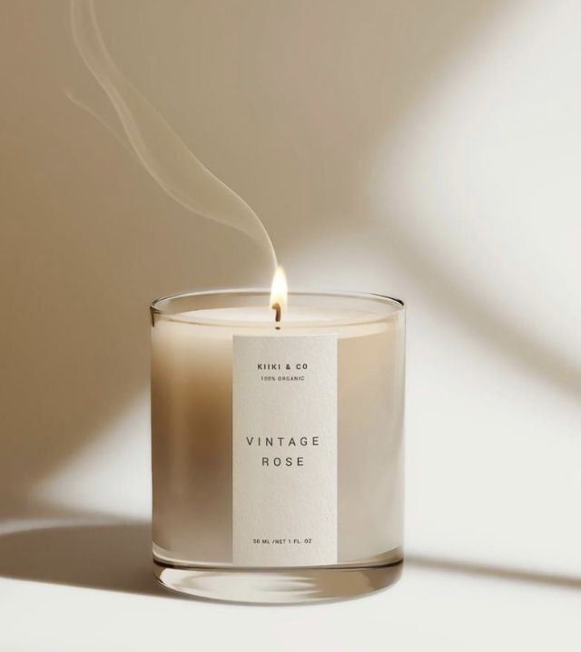 Aesthetic single wick candle with a soothing vintage rose scent, housed in a cream-colored glass body—perfect for adding a touch of elegance and charm to any space.